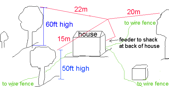 This breeze is a real pain! Every time I fire the arrow into the tree it blows back and falls out or lands on the top and won't fall through. Umpteenth try lucky and I can now add another 50Mtrs of wire running, at about fifty feet high, from the Southern support towards the North-West. Total length of wire in the air now about 130Mtrs and the current is up to almost l.5Amps. I manage to work G3GR0 in crawley, that's over 300 miles away, I only get 339 but it's not a bad distance.