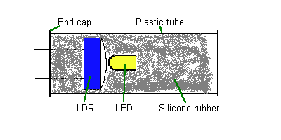 The crux of the thing is to mount the LDR and LED in close optical contact whilst being careful to exclude all stray light from the assembly. I mounted mine in a piece of black plastic tubing and sealed it with silicone rubber and black end-caps.