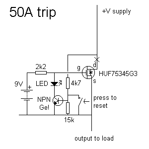 Component part number Cost ( ex VAT and carriage ) HUF75345G3 Farnell 247-030 £5.30 + VAT LED (red) any sort pence Ge NPN transistor see list below free from your junk box? If you want it to trip at a lower current you can add a bit of resistance at X, it's best to do this by trial and error, just a few inches of reasonably thick wire should do. Do not use it at more than 12V or so, or the current through the 4k7 resistor will exceed the base current rating of the transistor when tripped.