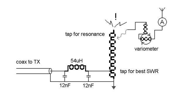 Start with the low-power setting on the tx and key up. If you have an aerial current meter, a small peak should coincide with a dip in reflected power. Optimise the SWR with the earthy-end taps (you will need the pi-network in cct if your tx reacts the same way as mine). The tx should be drawing just under 4A. When you are happy with that, switch to high power (Ropex warn not to operate the power switch with the key pressed) and try again. If there are no flash-overs and the SWR stays good then the tx should be drawing just under 15A, a slight tweak on the variometer should get this right.